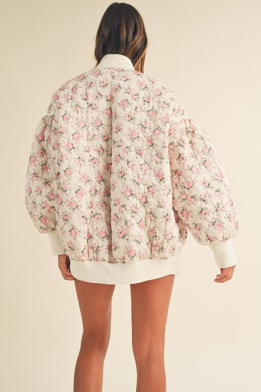 In Bloom Floral Quilted Oversized Bomber Jacket - Off White