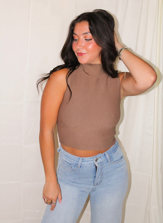 Lainey Mock Neck Ribbed Crop Tank - Brown