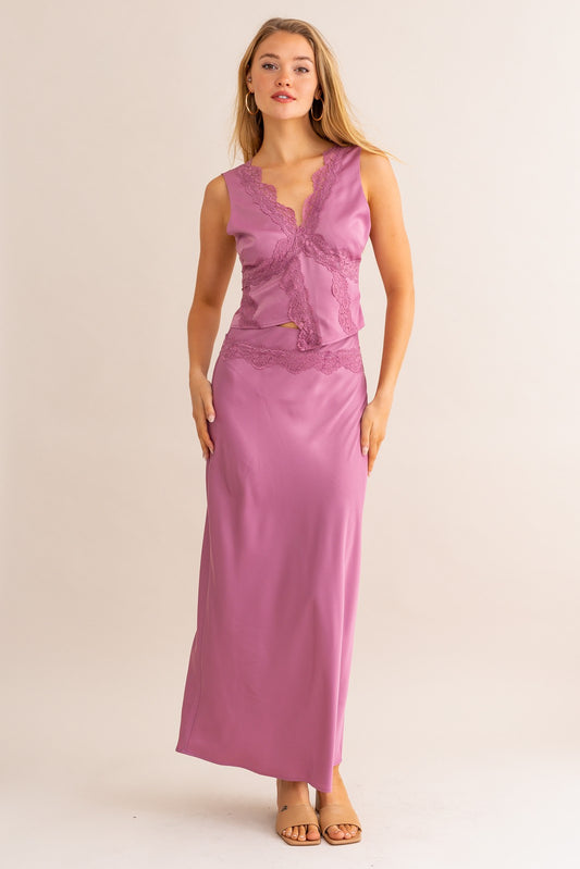 Lyra Satin Lace Trim Maxi Skirt - Mauve