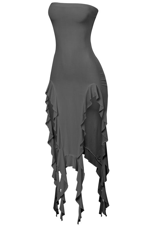 Aurora Ruffled Front Slit Strapless Midi Dress - Black