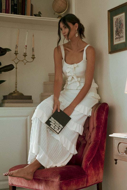 Coco Knit Bow Ruffle Tiered Bodycon Maxi Dress - Off White